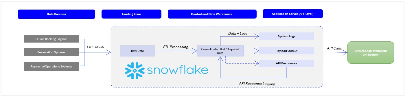 Data from all source systems were ingested and consolidated into Snowflake, ensuring a single source of truth for chargeback processing.